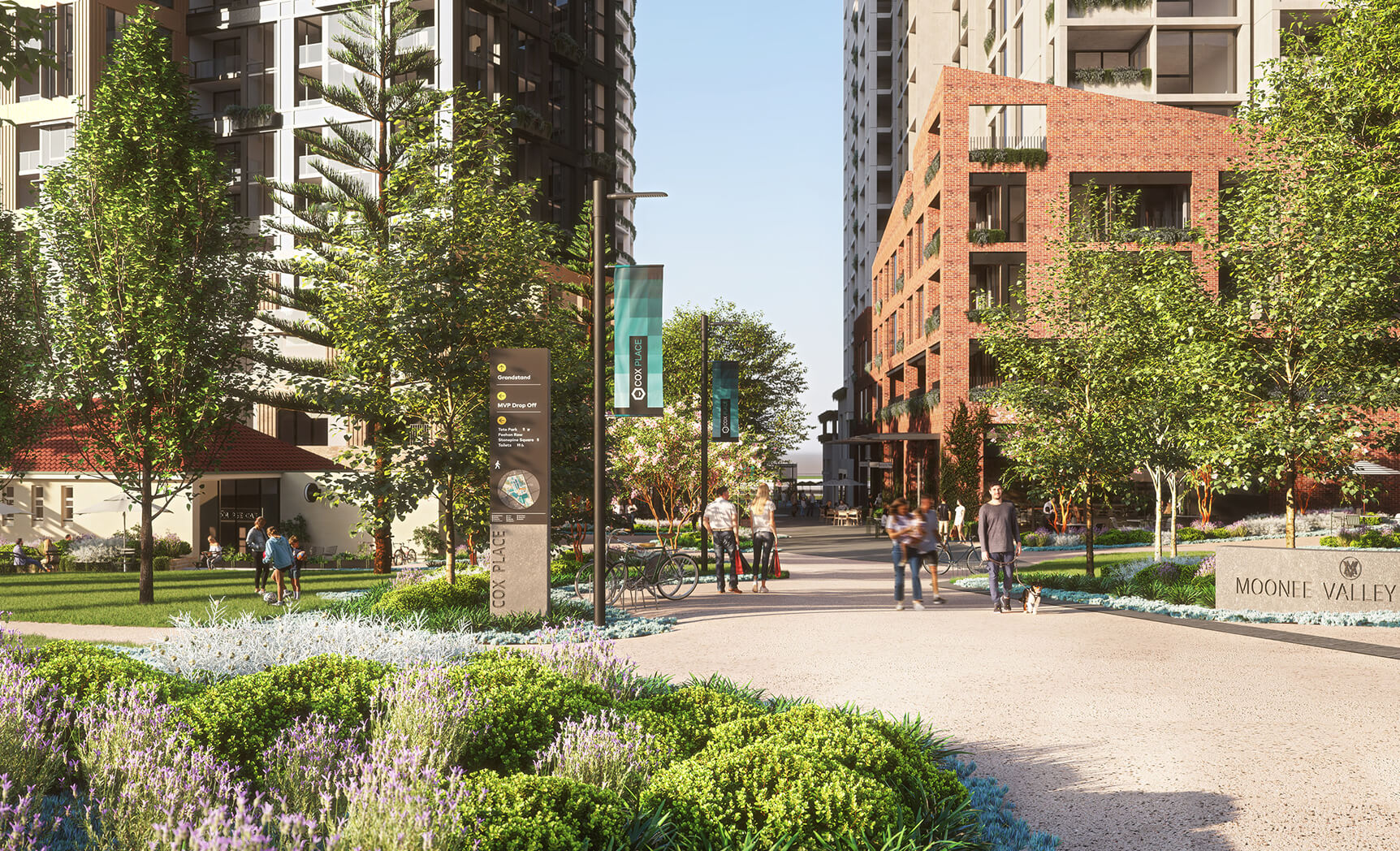 Conceived as a Neighbourhood within a Park, half of Moonee Valley Park’s 40 hectares has been devoted to curated green space and living landscapes. Underpinned by a nature-based philosophy, this vibrant 10-minute walkable community will be, when complete, a place of wellness and connection where residents can live, shop, dine and unwind within a botanical setting.